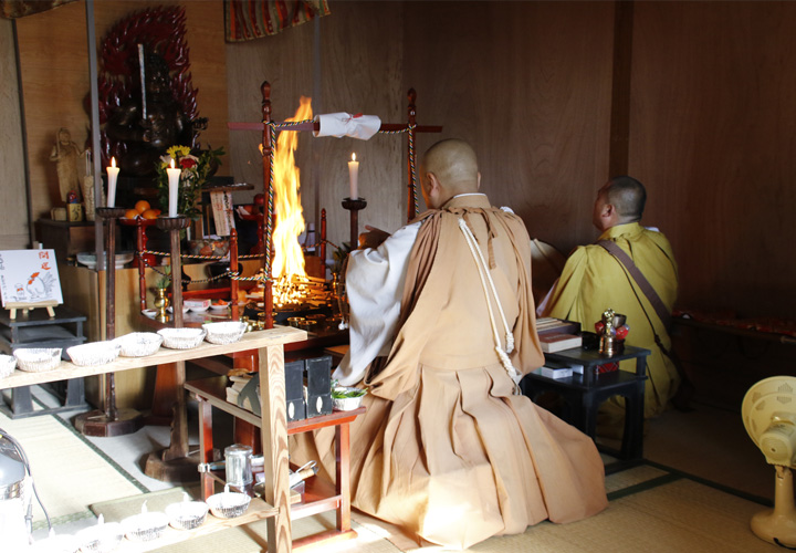 毎月、6日午後2時より地元の方と共に境内の護摩堂にて護摩供養を厳修しております。