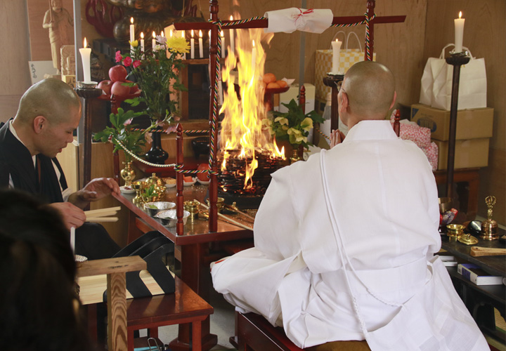 護摩とは行者(僧侶)が不動明王と一体となり、己が煩悩を不動明王の火炎で焼き尽くし、悟りの境地に入る為の修法です。