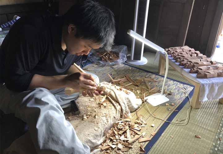 常住寺本堂にて叩き彫を制作する昭雲工房 山田直禾氏。
